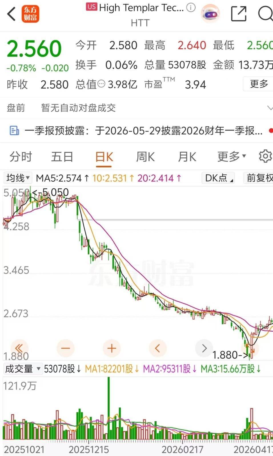 r具体来看,HTT股票自2025年12月8日开始出现断崖式下跌,股价从彼时的4.89美元一路走低至1.94美元,最低时仅有1.88美元。截至2026年3月31日,该股票区间跌幅高达60.33%。