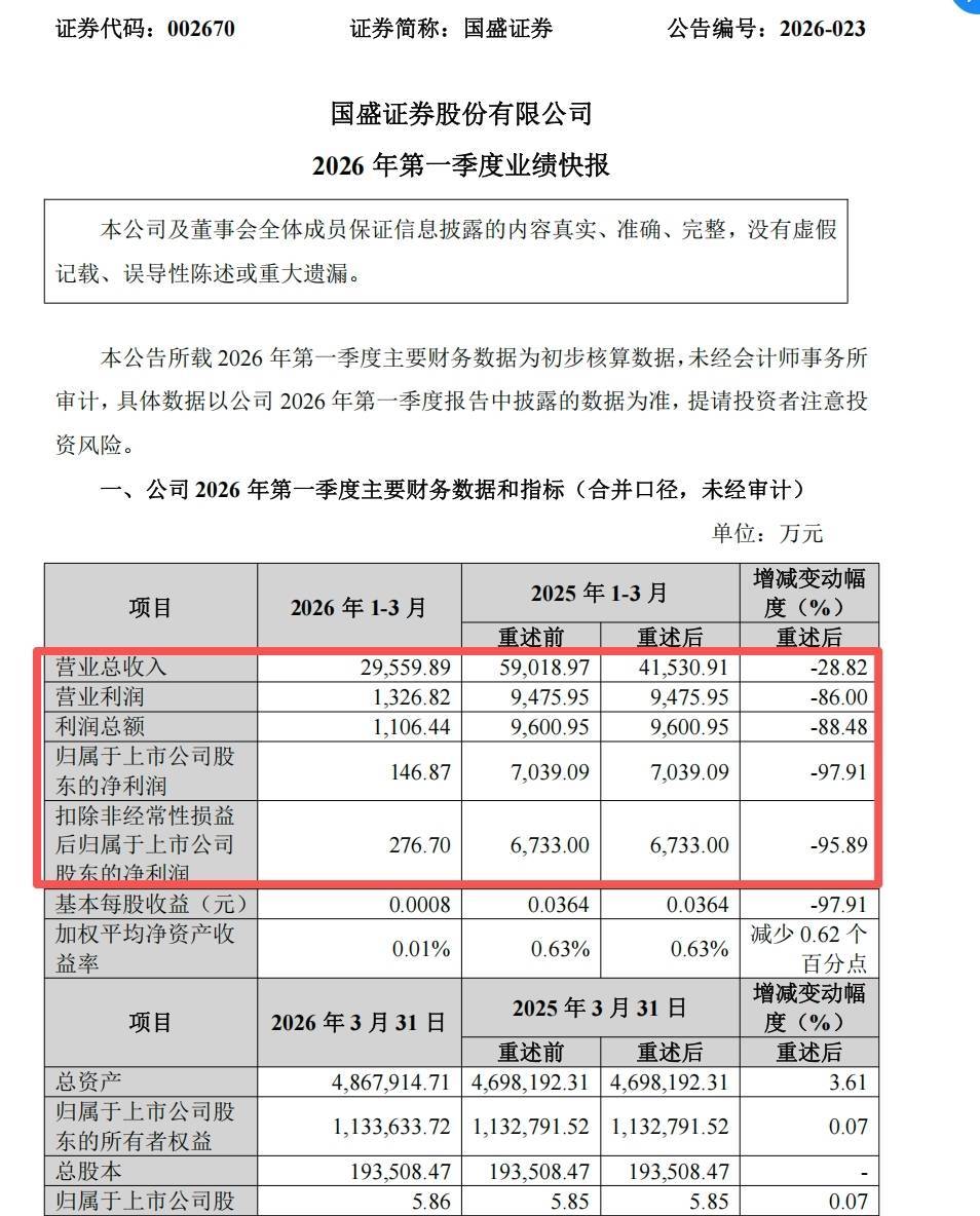 r4月20日,国盛证券发布2026年第一季度业绩快报,今年一季度,公司实现营业收入2.96亿元,同比下降28.82%;归属于上市公司股东的净利润为146.87万元,同比下降97.91%。