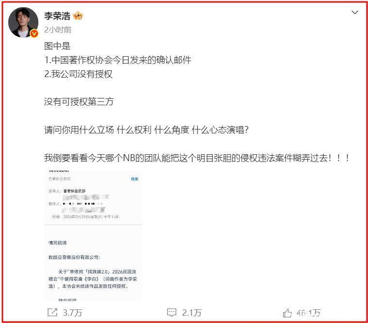 3月29日下午,李荣浩突然发长文控诉单依纯强行侵权。