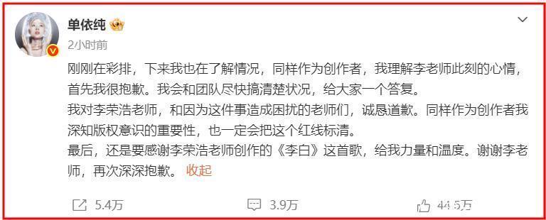 在长文中,李荣浩直言单依纯没有取得中国著作权协会和他的公司的授权,在3月28日的深圳演唱会上演唱了《李白》,强行侵权。