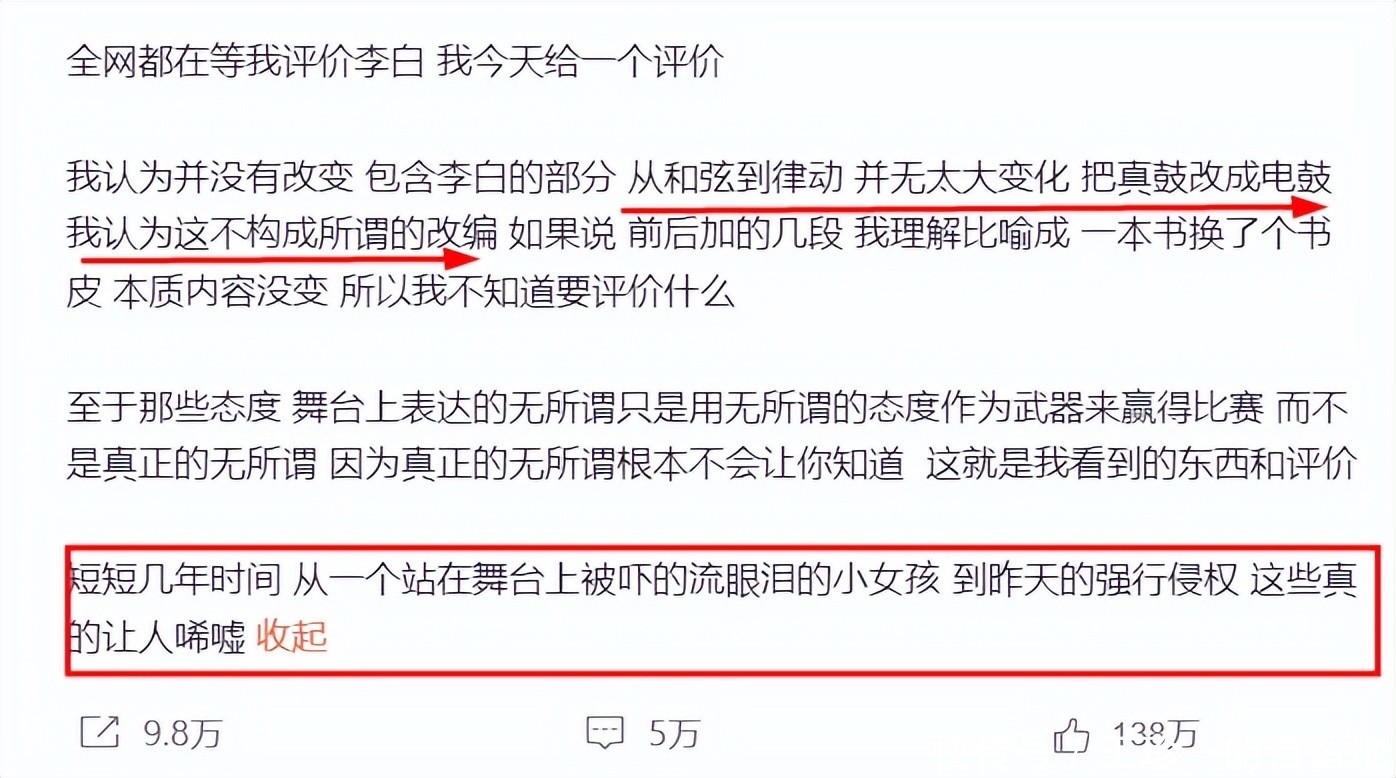 在文章的最后,他更是感叹“短短几年时间,从一个站在舞台上被吓的流眼泪的小女孩,到昨天的强行侵权,这些真的让人唏嘘。”
