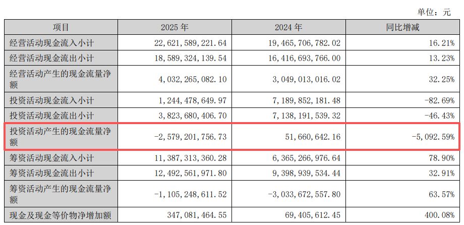 尽管期内取得诸多成绩,但《每日经济新闻》记者注意到,圣农发展2025年投资活动产生的现金流量净额同比转负至-25.79亿元,上一年为5166.06万元。公司称,一是取得子公司及其他营业单位支付的现金净额较上年增加11.11亿元,主要是本期公司完成对安徽太阳谷的并购,支付了股权转让款;二是本期赎回理财产品及申购理财产品的差额较上年同期减少11.1亿元。